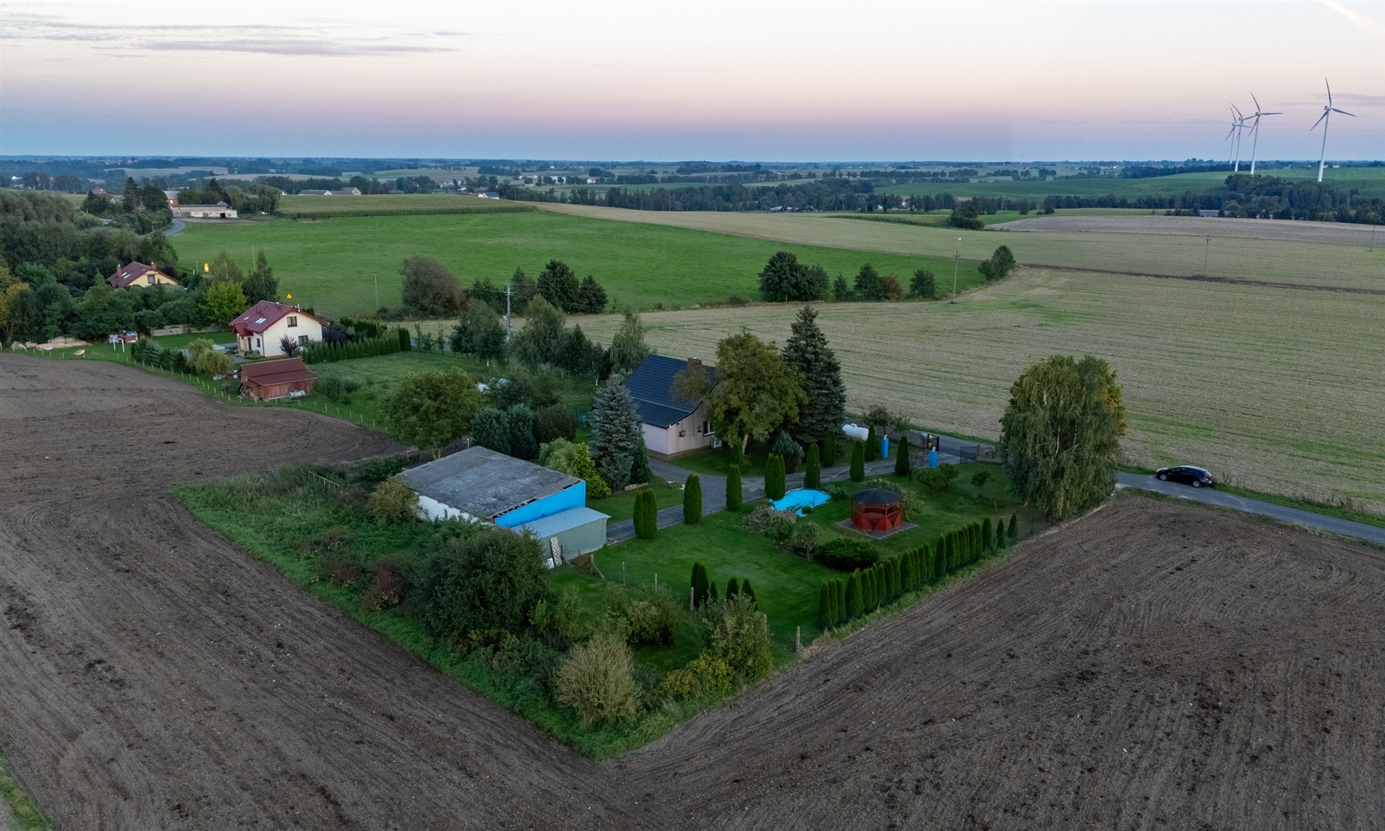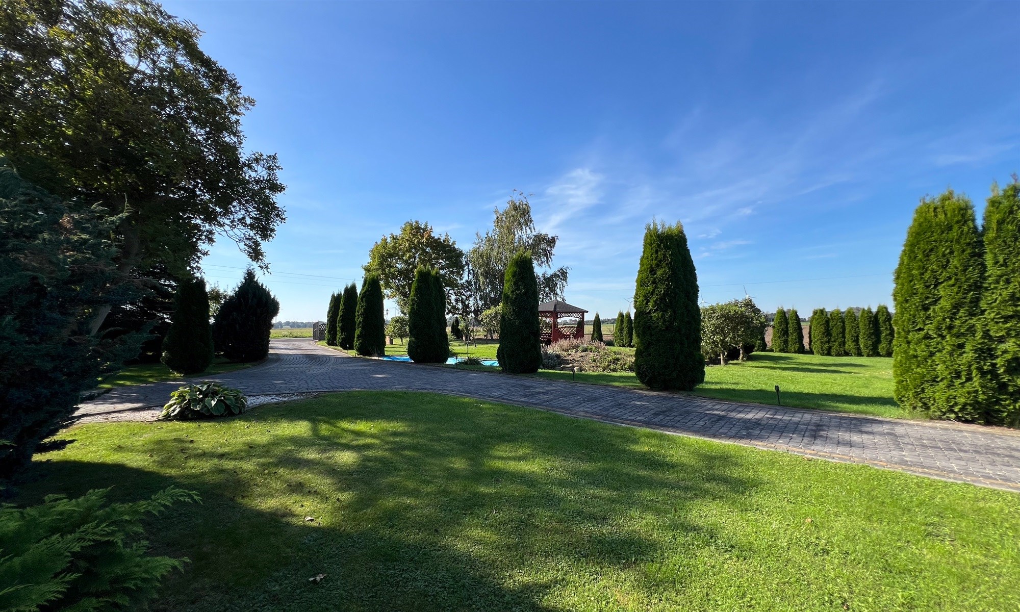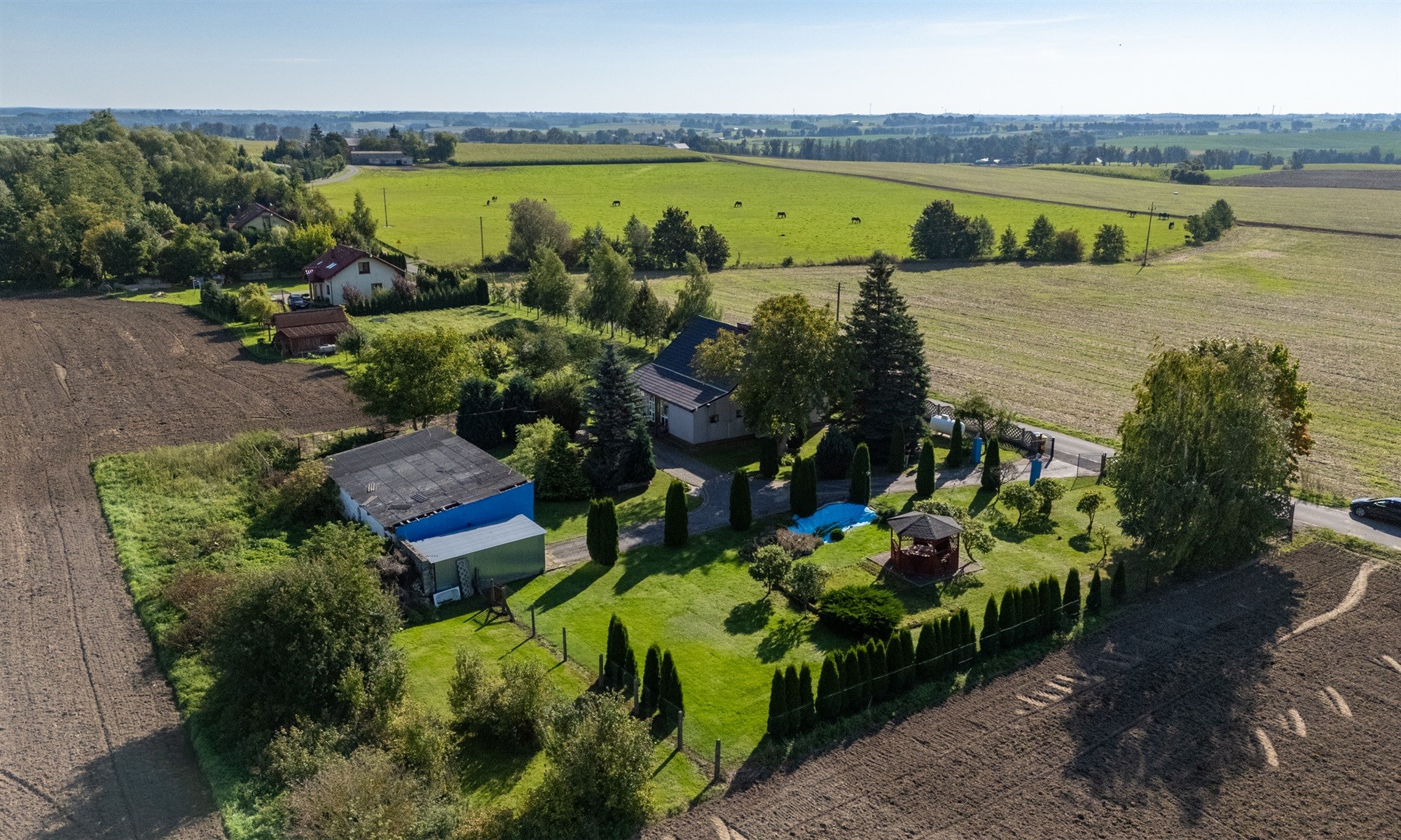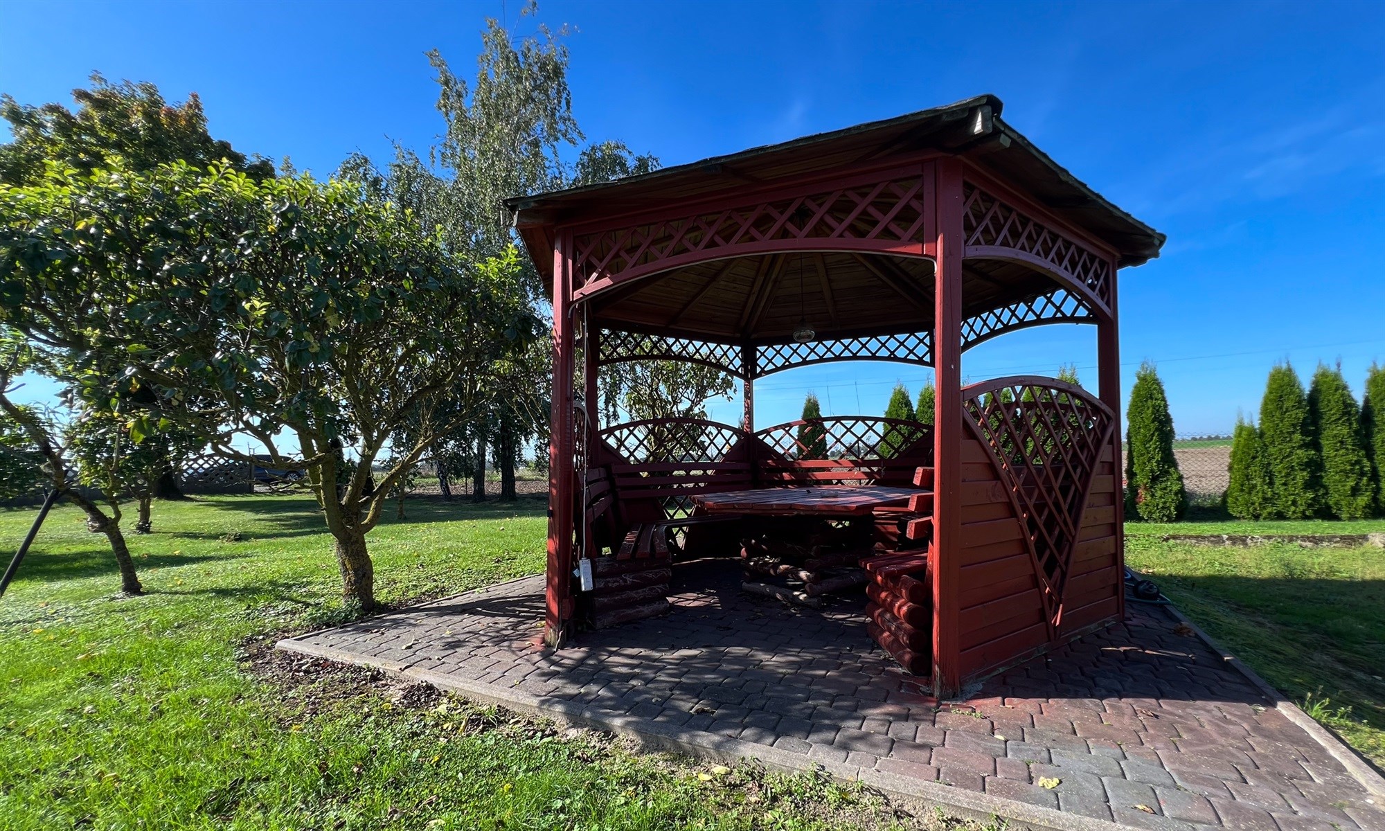 Działka o powierzchni 3013 m² została w całości ogrodzona i urządzona tak, aby była funkcjonalna i estetyczna. Przed domem znajduje się podjazd wyłożony kostką, a obok murowany budynek gospodarczy oraz blaszany garaż. Dopełnieniem klimatu są drewniana altana i oczko wodne, które tworzą idealną przestrzeń do relaksu. Na terenie znajduje się również stara studnia głębinowa – świetne źródło darmowej wody do podlewania ogrodu. Nie zabrakło miejsca na własny ogródek warzywny, a duża przestrzeń działki daje ogromne możliwości rekreacyjne.